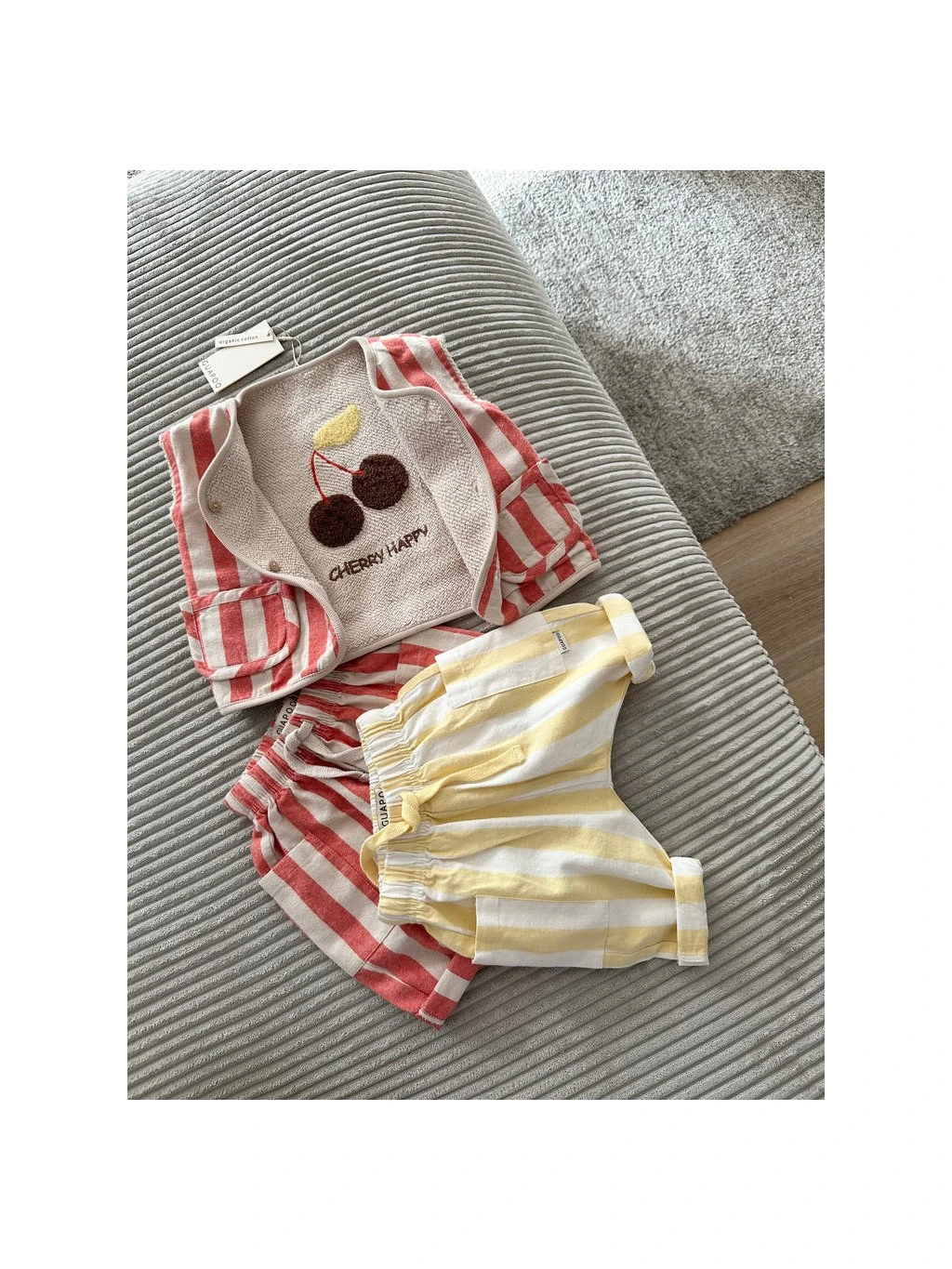 Žltý prúžkovaný vzor im dodáva svieži, hravý look a voľný strih zabezpečí pohodlie počas celého dňa. Praktické bočné vrecká ukryjú všetky malé poklady aj obľúbené drobnosti.