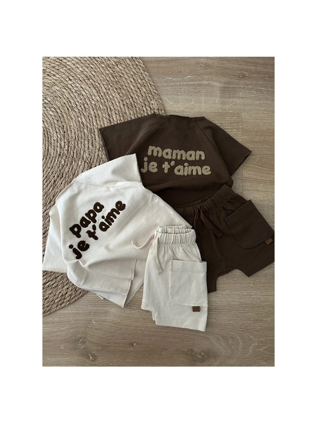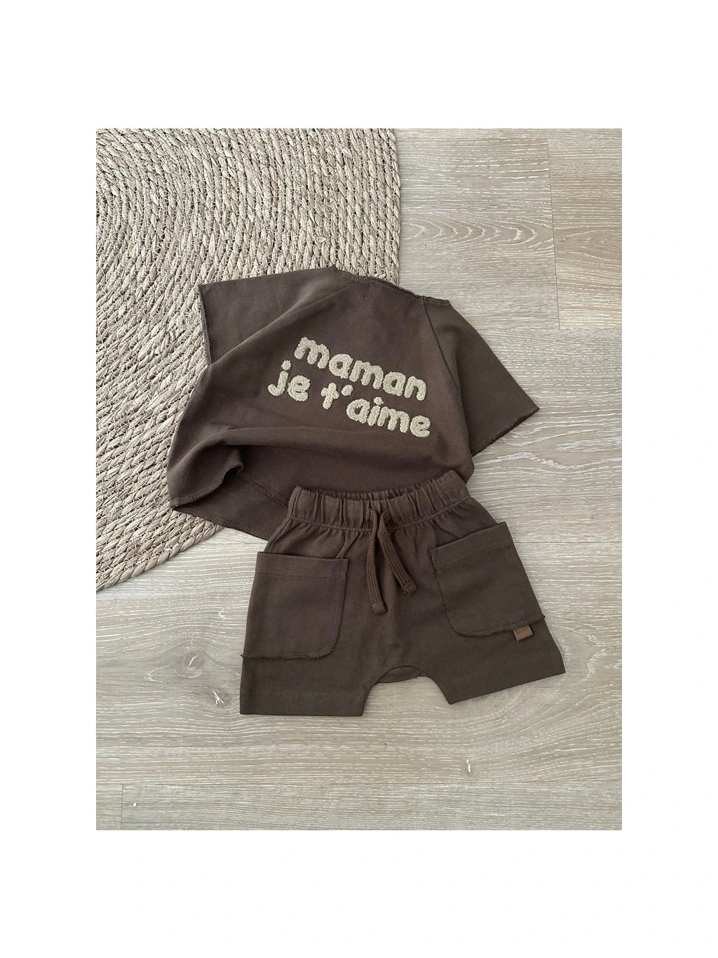 Vďaka voľnejšiemu strihu sa príjemne nosí počas celého dňa. Vpredu má vrecko na poklady. Jemný nápis „maman je t’aime“ vzadu mu dodáva hravý, ale zároveň nežný detail, ktorý si zamilujete.